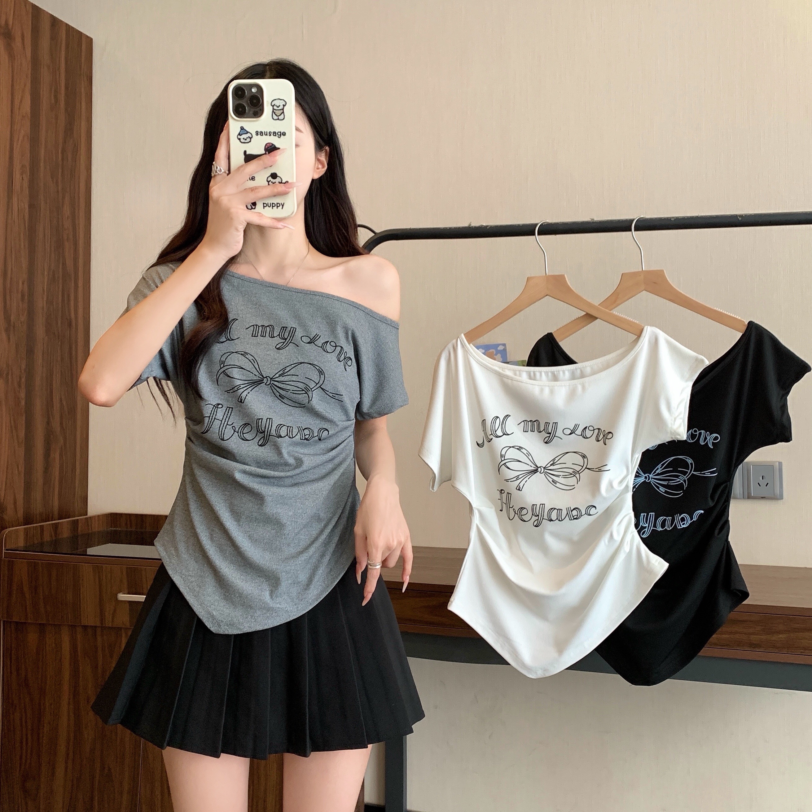 A3426(3280) 美式斜领蝴蝶结字体印花褶皱腰斜开角3色上衣