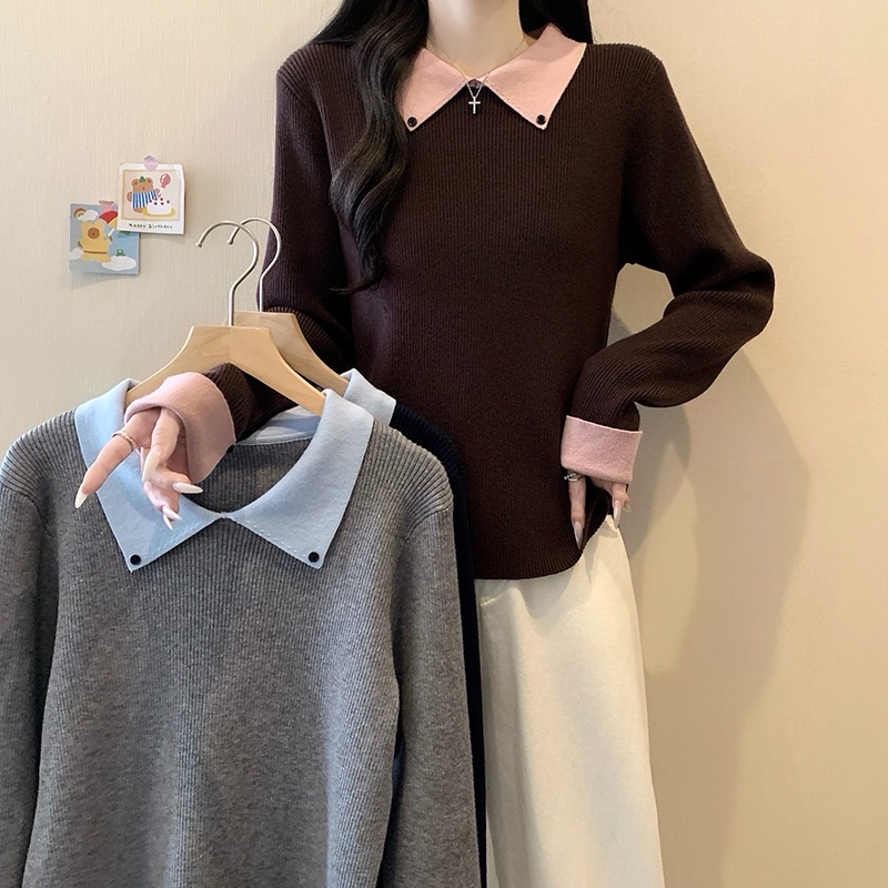 A3454(3825) 韩版甜美风拼撞色翻领与袖边单小钮3色针织上衣