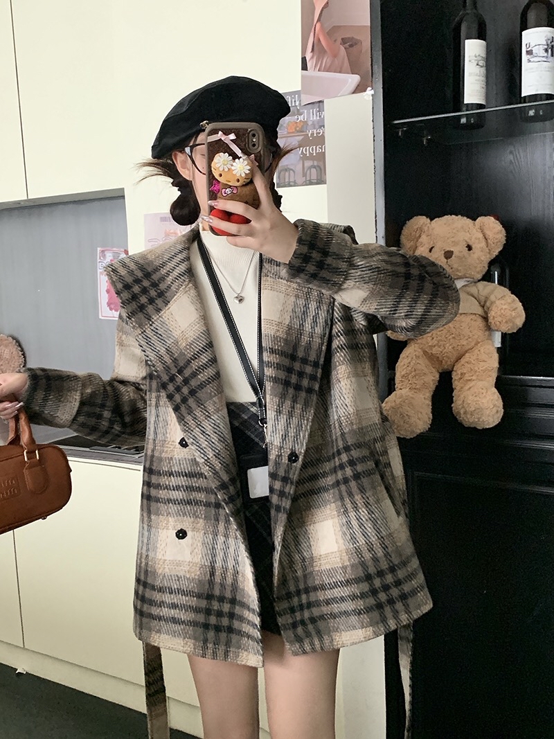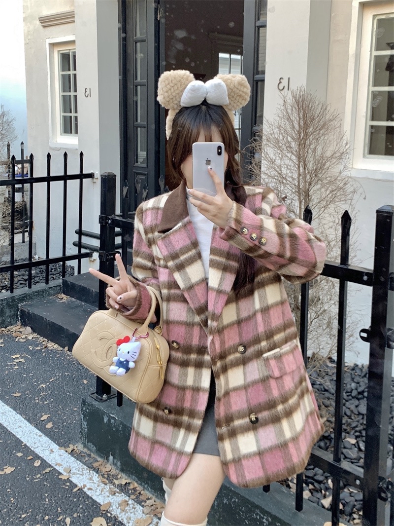 A3304(18252) 韩系秋冬毛呢夹棉西装式撞色格纹粉外套