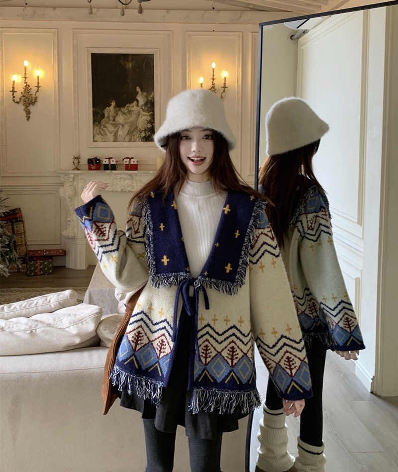 A3334(25105) 韩系民族风复古拼蓝须须边翻领与下摆杏毛针织外套
