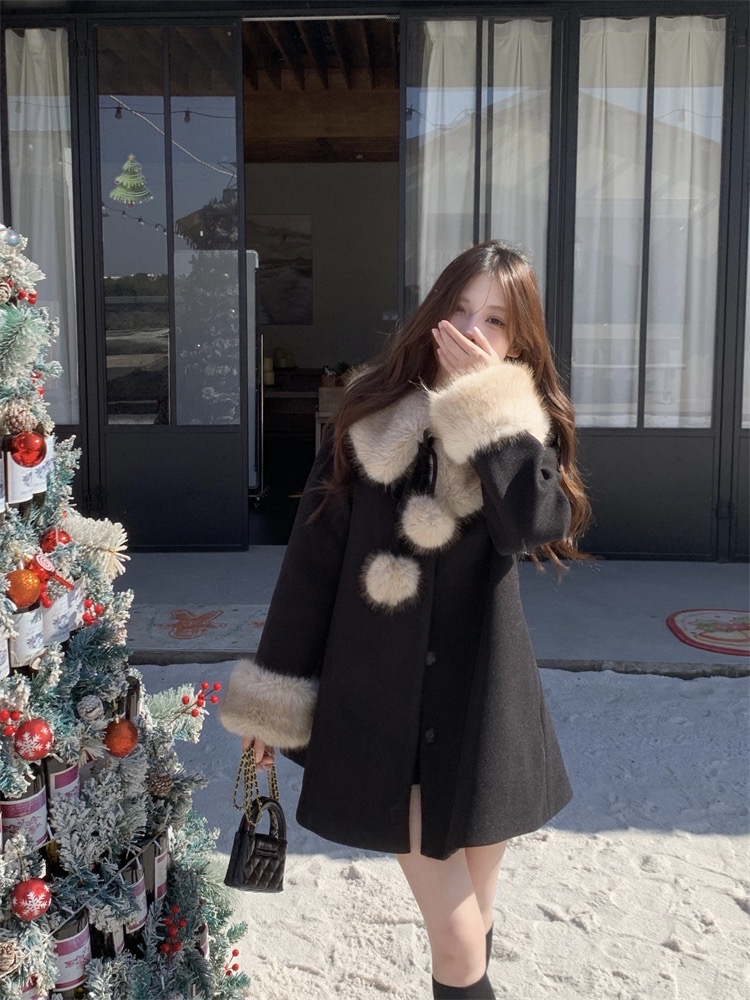 A3251(18615) 韩系千金风毛呢斗篷式毛毛翻领与流苏毛球黑外套大衣