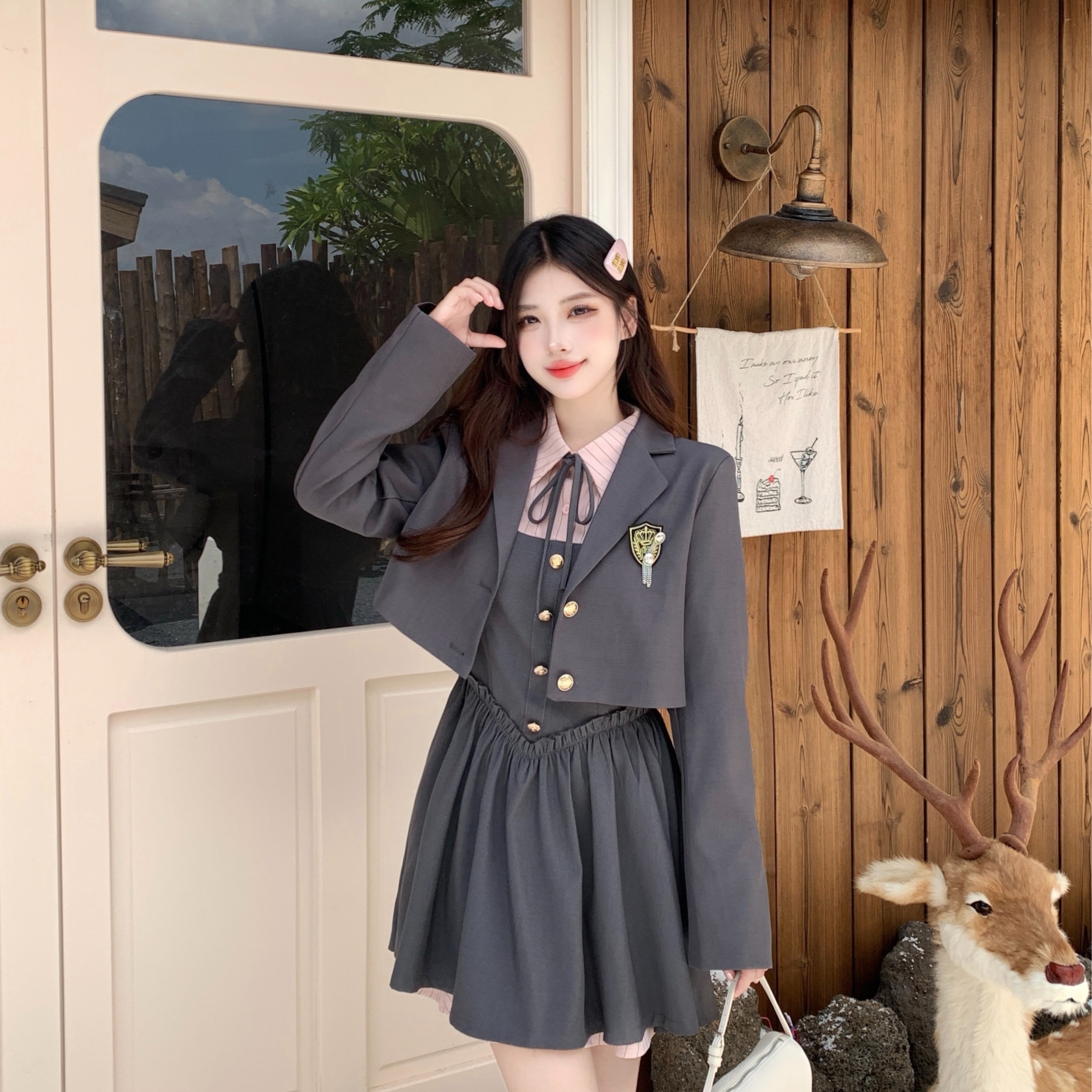 A3466(9987外套) 韩版甜美学院风徽章西装翻领灰短板外套