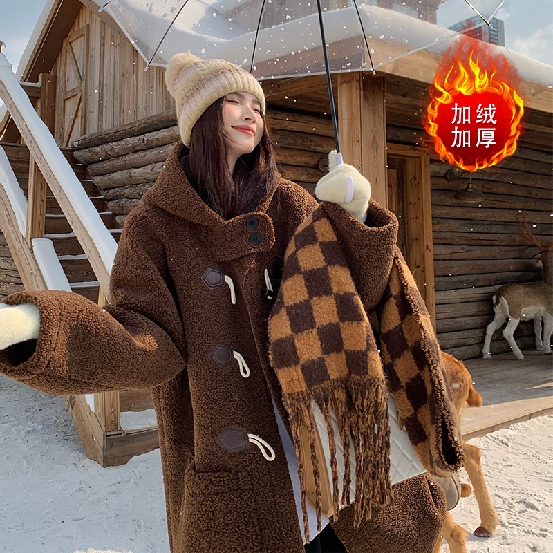 A3291(8072) 韩系加绒加厚前排皮质盘扣羊羔绒长版黑咖外套大衣